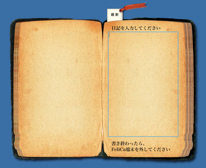 FeliCa(種類は問いません)を端末に載せると、日記帳がパラパラと開き、最新の書き込みページが表示されます。