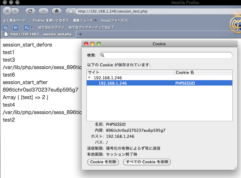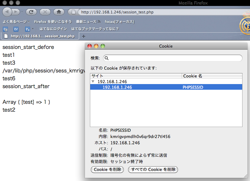 もう一度実行します。今度はローカルにPHPセッション名で保存されるCookieデータがありますので、Cookieに保存されているセッションIDが表示されています。