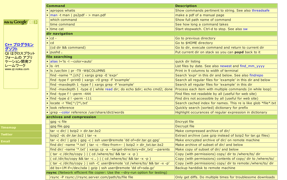 このチートシート(というかページ)には、find/xargsなどかゆい所に手が届くコマンドの具体例が載っているので便利です。