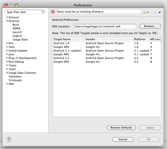 このADT PluginをインストールするとAndroidアプリケーション開発のための様々な機能がEclipseに追加されます。設定の中にSDKのPATHを指定する箇所があるので先にインストールしたSDKのPATHが設定されているかどうか、設定されていない場合は設定しておいてください。