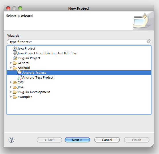 新規プロジェクトで[Android][Android Project]を選択し次へ進みます。