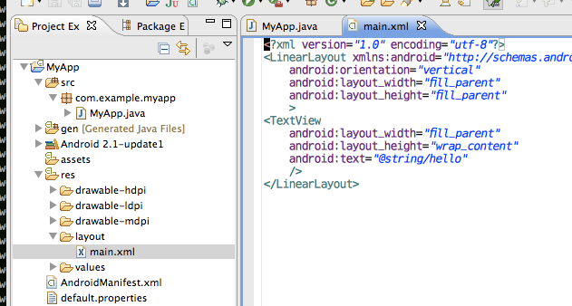 先ほど実行したときにHello Worldと文字列が表示されましたがそれはここのTextViewに記述されているためです。