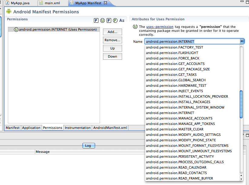 下にあるタブの中の[Permissions]を選択し、[Add...]から[Uses Permission]でandroid.permission.INTERNETを選択します。