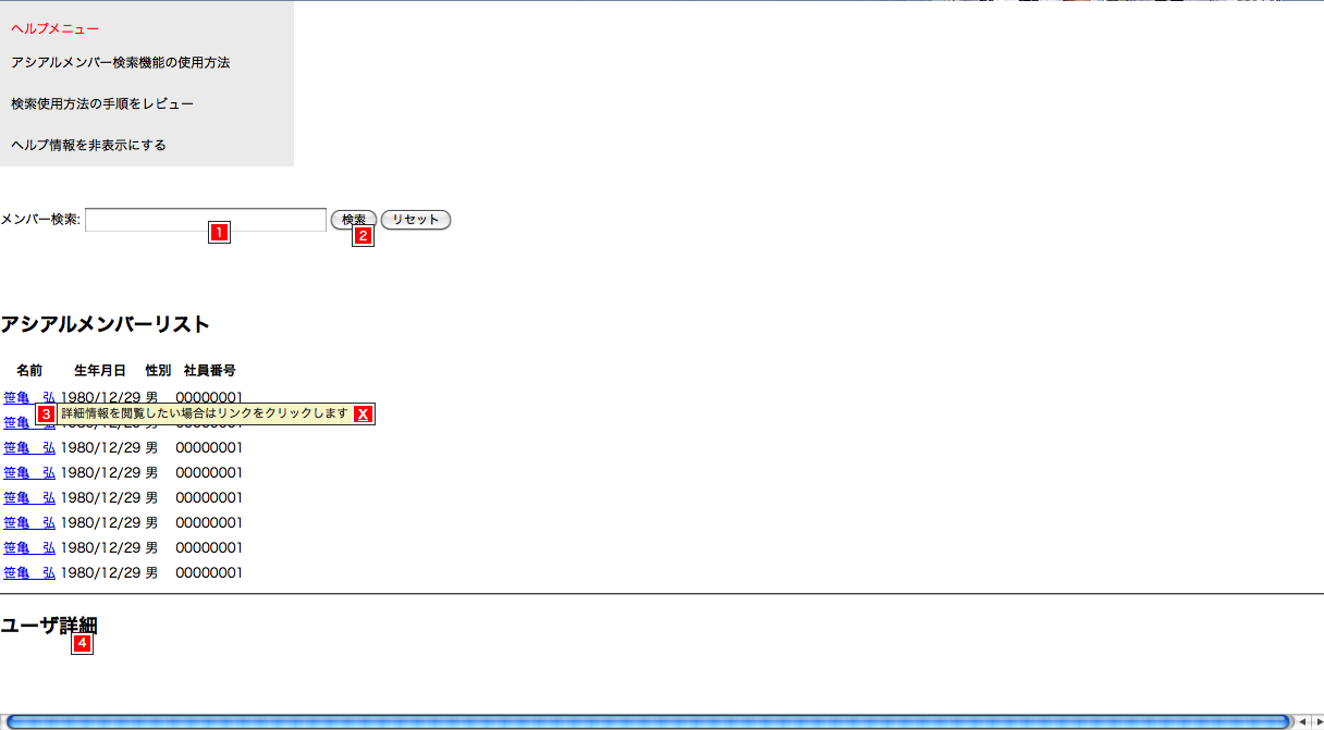※「アシアルメンバー検索機能の使用方法」「検索使用方法の手順をレビュー」の2つのリンクでヘルプのサンプルが動作するようになっております。