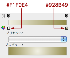 まず、500×500pxの矩形オブジェクトを作成します。そして、古い紙のイメージを出すため、グラデーション(円形)を下図のよ うに#F1F0E4 → #928B49で設定します。