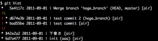 ちなみに、「git hist」のエイリアスは、以下のようなツリー表示のログが簡単に確認できて便利です。