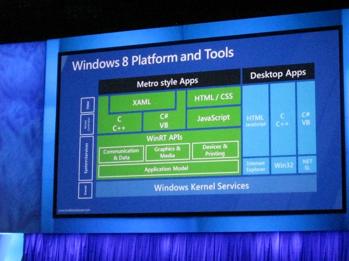 今回のカンファレンスで大きく取り上げられているMetro Style。UIを含む新しいAPIセットであるWinRTアーキテクチャの上に、HTML+JSやXAML+C#でアプリ層を記述するということからも、完全に過去の互換性は切り捨てています。ポイントは、ARM版でも再コンパイル無しに動作することと、完全にこれまでと異なるUIを持つことです。
