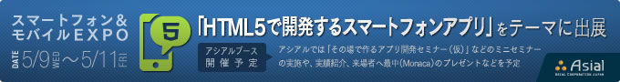 ソフトウェア開発・保守・運用のための製品・技術が一堂に出展する日本最大級の専門展、ソフトウェア開発環境展にブース出展いたします。アシアルは、スマートフォン&モバイルEXPOに「HTML5で開発するスマートフォンアプリ」をテーマに参加します。