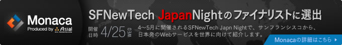 既に、Monacaブログ: 「第4回 SFNewTech Japan Night セミファイナル結果ご報告」 などで、ご存知方もいらっしゃるかと思いますが、この度 、アシアルが提供する「Monaca」が、SFNewTech Japan Night のファイナリストに選出されました。