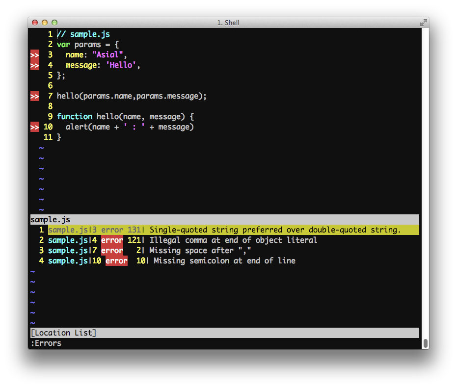 また、警告がある場合は、vimで「:Errors」コマンドを実行すると、