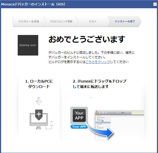 このリンクから、デバッガーをダウンロードできます。上の画面は、「iTunes経由でインストール」を選択した際のビルド完了画面です。