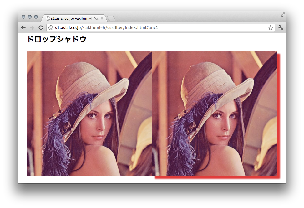 ドロップシャドウを適用するにはdrop-shadow関数を使います。引数は、x方向の大きさ、y方向の大きさ、影の広がり、色の順で指定します。